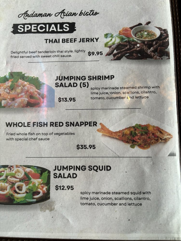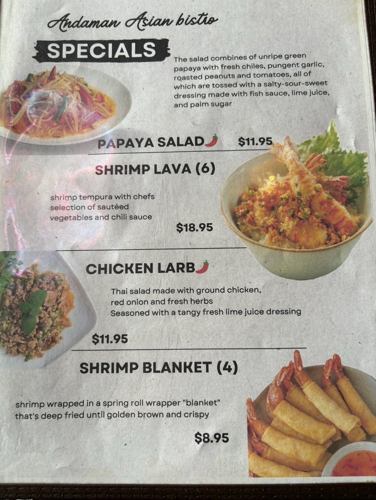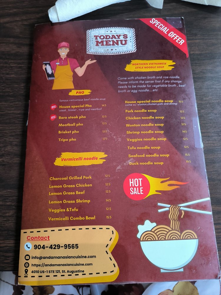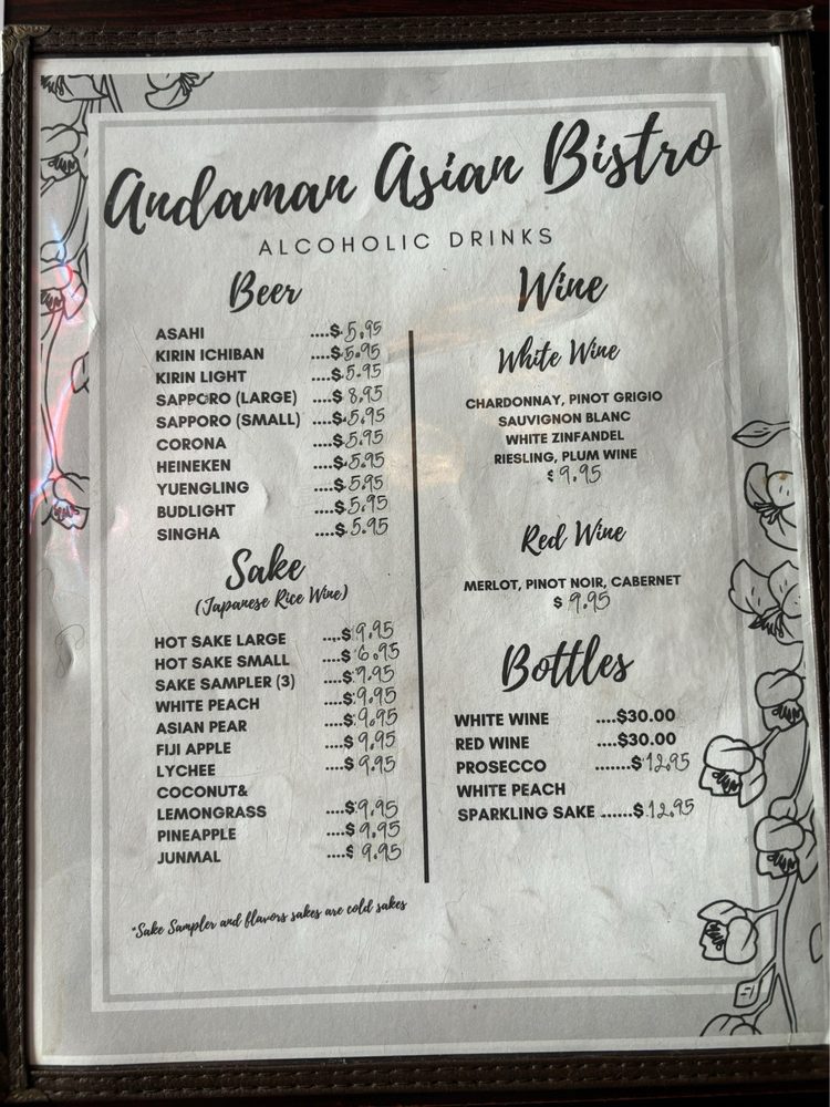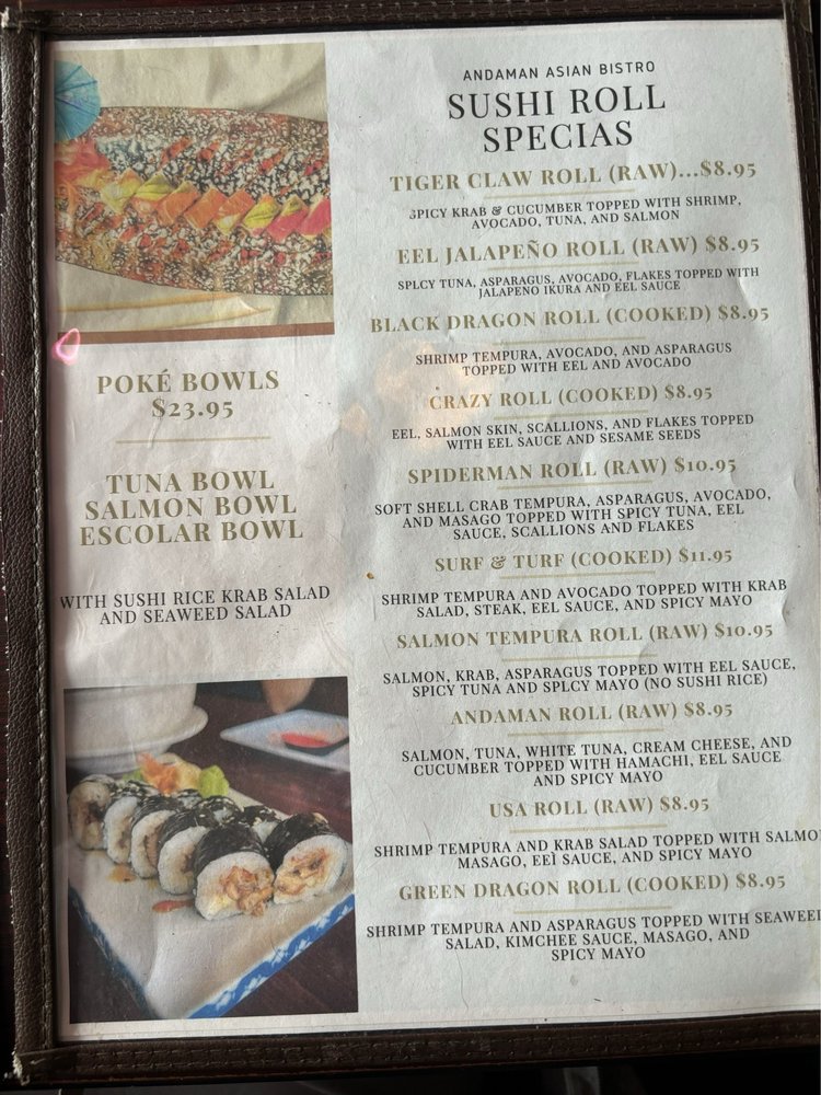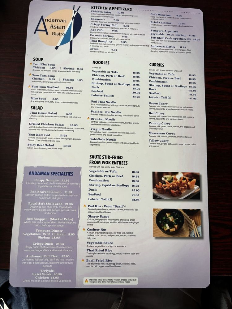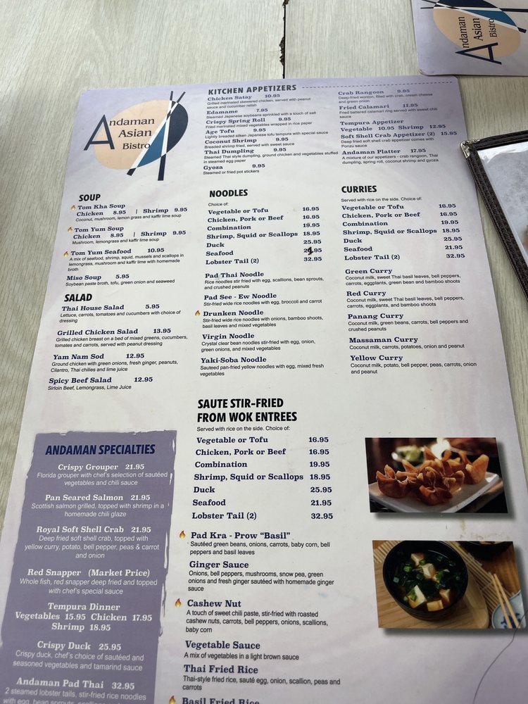 Andaman Asian Bistro offers a wide variety of Thai, Vietnamese, and Sushi options in a casual and inviting atmosphere. Located in St. Augustine, FL, this bistro provides options for all dietary preferences, including vegan and vegetarian dishes. The menu features delicious kitchen appetizers like Chicken Satay and Edamame, as well as tempting Sushi Bar Appetizers. Customers rave about the flavorful Tom Yum Seafood Soup and the fresh Teriyaki Steak bento lunch. With attentive staff, ample portions, and reasonable prices, Andaman Asian Bistro is a must-visit for Asian cuisine lovers. Don't miss out on their eclectic selection of dishes, from traditional Pad Thai to innovative sushi rolls. Enjoy a memorable dining experience at Andaman Asian Bistro.